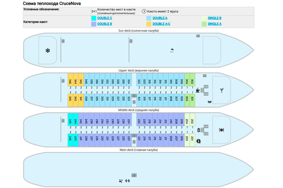 Такое инженерное решение позволило оборудовать французскими балконами все каюты на средней и верхней палубах. Эргономичная планировка кают сводит к минимуму проникновение посторонних звуков и создает максимально расслабляющую обстановку.